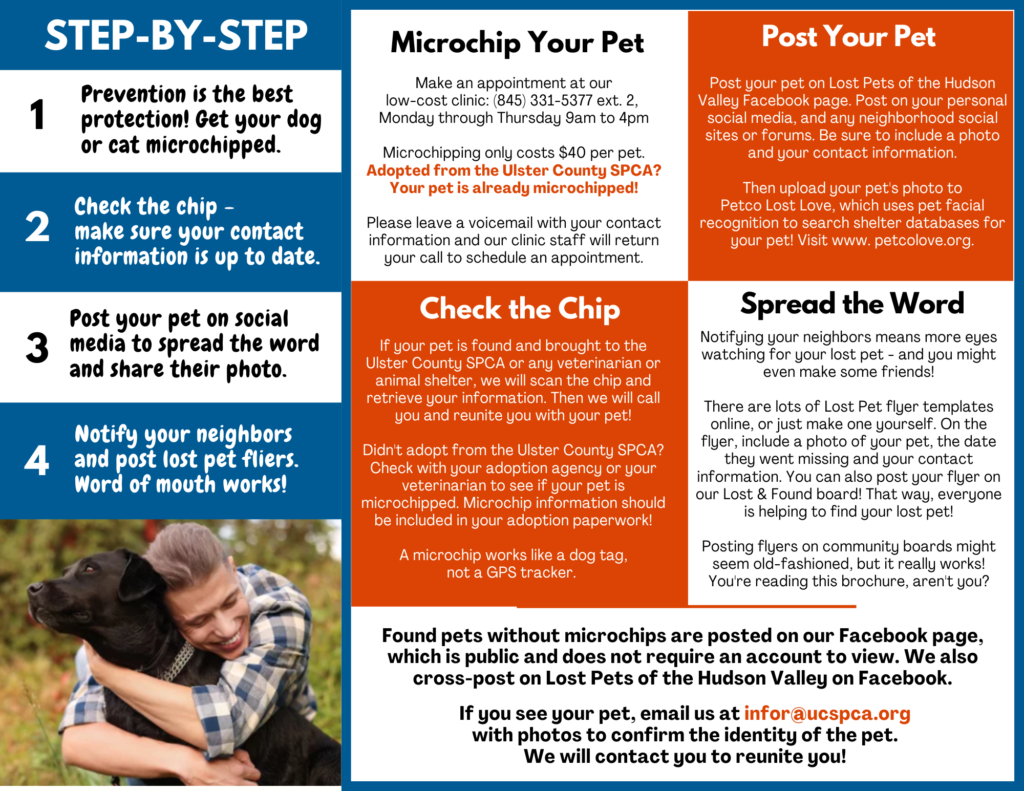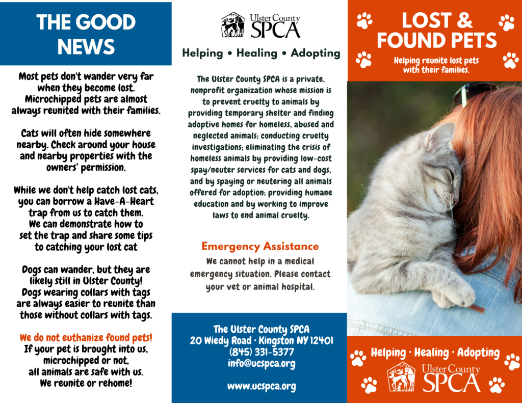 PetCo Lost Love is a a free database created by PetCo to report, search, and share lost and found pets. Their database includes pets reported by individuals as well as thousands of shelter partners across the country. Create an account with them, then upload a photo of your lost or found pet. You can then share your lost pet to your community through social media, emails and text alerts. Print standardized lost pet flyers to help increase the chance neighbors have seen your pet in the area. Connect up with local shelters, including the Ulster County SPCA, when you submit your pet into the database. Receive an alert when someone recognizes your pet’s photo or finds and reports them through PetCo Lost Love. And when you find your lost pet, change their status to found in the database so everyone will know you and your best friend were safely reunited.